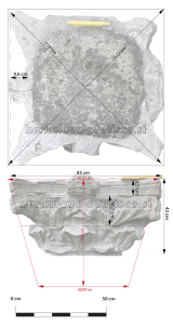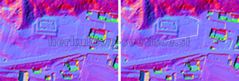 Lahko pa deloma rekonstruiramo tudi zid tempeljskega dvorišča, ki ga poleg na rezultatih geofizikalnih raziskav (Slika 59) lahko prepoznamo tudi na rezultatih lidarskega snemanja (Slika 80). Tako združeni podatki omogočajo tlorisno rekonstrukcijo celotnega svetiščnega kompleksa (Slika 81).