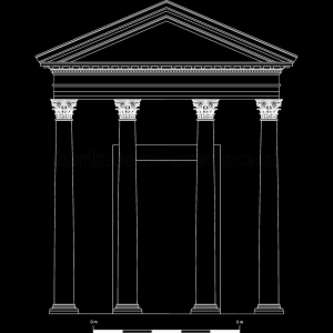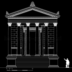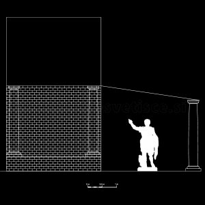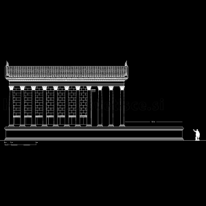 Tako določena razmerja so omogočila izdelavo osnovne risarske rekonstrukcije, pri kateri pa amo manjkajoče elemente dopolnili z izrisi še danes skoraj popolnoma ohranjenega templja Maison Carée. V primerih, ko smo določen podatek lahko črpali iz ohranjenih elementov celjskega svetišča (npr. višina spodnje profilacije podija), smo to ustrezno vključili v rekonstrukcijo. Na podlagi tako opredeljenih podatkov smo izpeljali risarsko rekonstrukcijo pročelja (Slika 65) in stranskega risa (Slika 66) templja, ki je služila za osnovo za vizualiziran tridimenzionalen model.