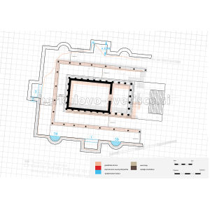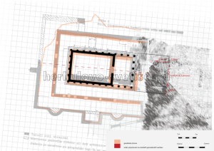 Slika 67. Tloris rekonstruiranega templja s stopniščem (podložen je Klemenčev načrt, geodetska izmera, predlog nove rekonstrukcije in rezultat geofizikalnih raziskav na 16ns)