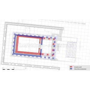 • da je opazno neskladje med zidom templja, označenim na Klemenčevem načrtu in danes rekonstruiranim zidom templja